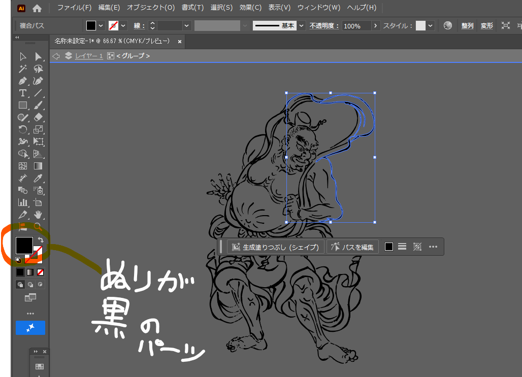 選択するパーツはどこでもOKですが、塗りが黒であることを確認してください。(囲まれた空間には塗りが透明のパーツが含まれています)