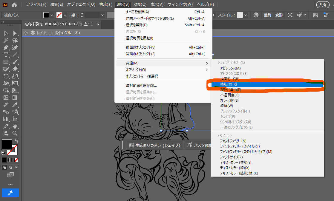 ③ 上部メニューから「選択」→「共通」→「塗りと線」を選ぶ